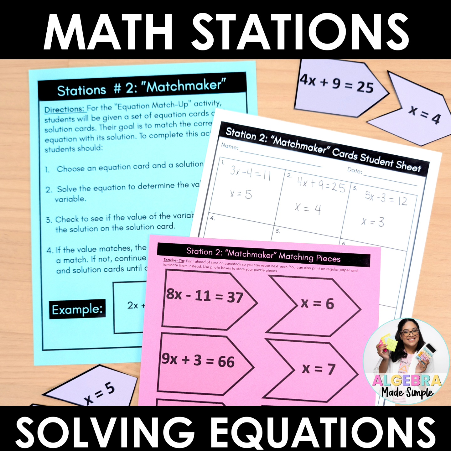 4 Math Station Activities to help your students solve multi-step equations. Includes a variety of fun activities