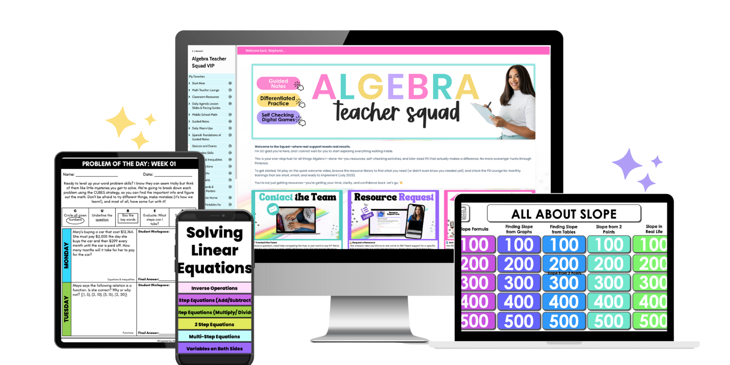 A monthly membership for 7th, 8th, and Algebra 1 teachers with scaffolded lessons, built-in differentiation, and time-saving routines, so you can stop piecing things together and teach with clarity and confidence.
