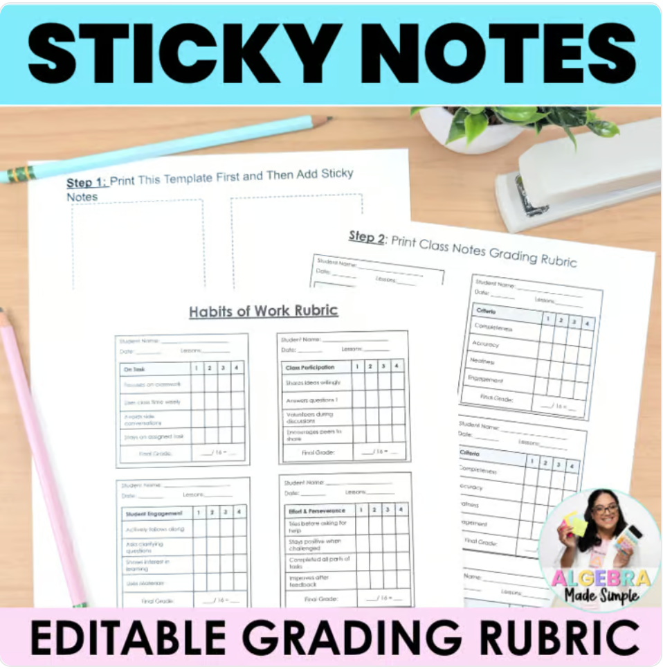 Editable “Sticky Note Grading Rubric for Class Work” + Habits of Work Checklist, the ultimate time-saving resource!
